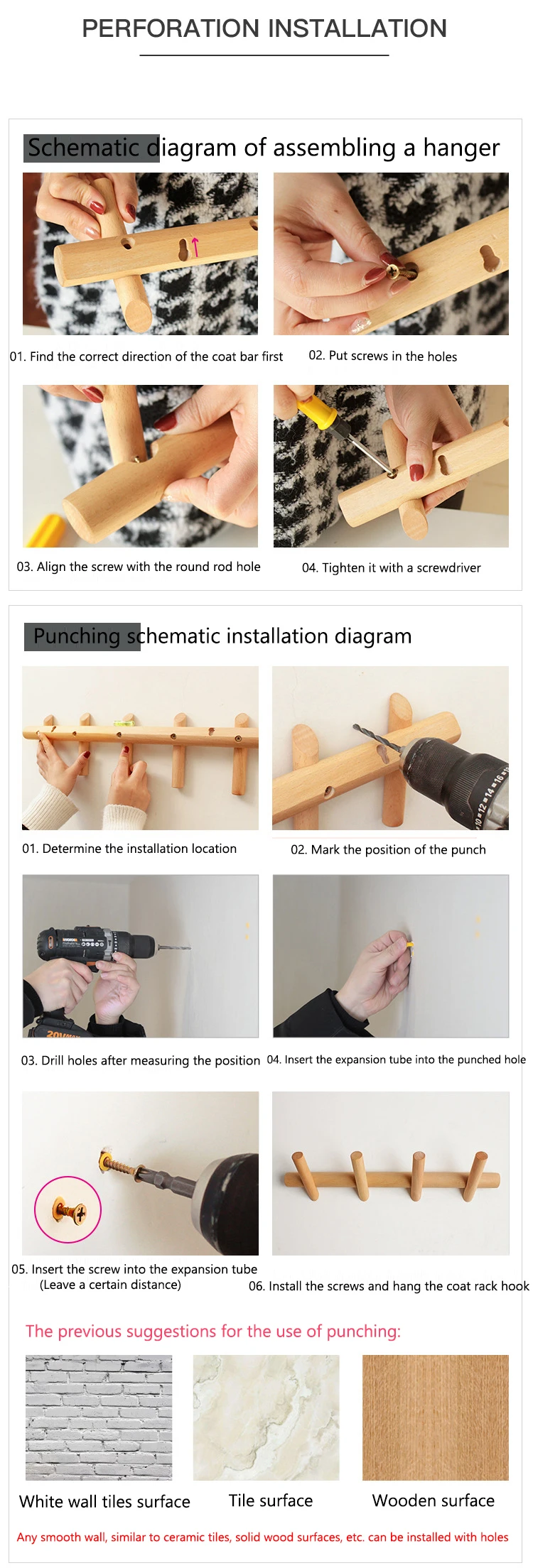 【Easy to Install】 Coat Hangers for Wall is very easy to install, the whole structure is pre-assembled, just need you to drill holes according to the "User Manual" → install the wall anchors → hang the Wood Wall Hooks for Coats.